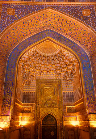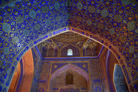 Samarqand, Uzbekistan - June 9, 2019: Interior with gold and blue colors of the Tillya-Kori Madrasah in the centre of Samarqand in Uzbekistan.