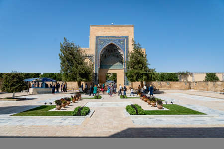 Tashkent, Uzbekistan-August 12, 2023:people in front of the Tamerlane Mausoleum with decorated tombs, mosaics and carvings during a sunny day