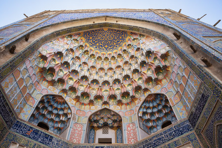 SAMARKAND, UZBEKISTAN: APRIL 28, 2018: Detail of a wall of Sher Dor Madrasa in Samarkand, Uzbekistan