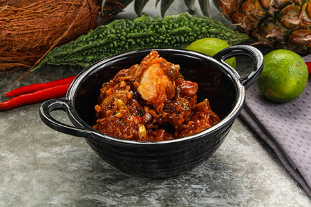 Thai Spicy Chicken in white bowl on black background, Thailand.