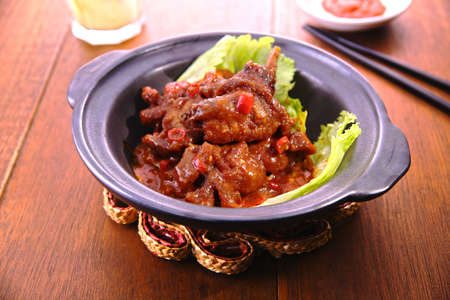 Spicy chicken feet food served on a plate with sauce, chili, cucumber and lettuce (1)