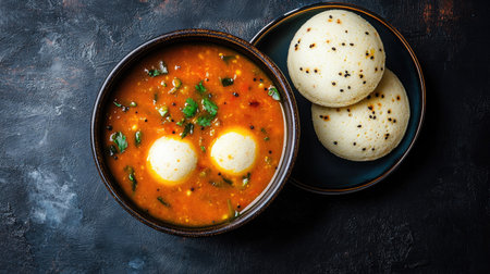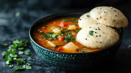 A colorful bowl of South Indian sambar with a side of fluffy idlis on a dark background, leaving room for copy space