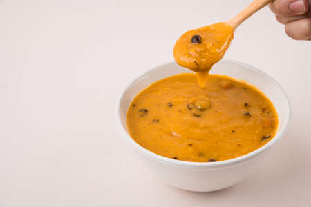 Indian lentil soup dal (dhal) in a bowl isolated on white background. Copyspace