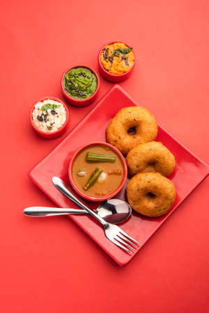 Vada or Medu vadai with sambar and chutney - Popular South Indian snack or breakfast