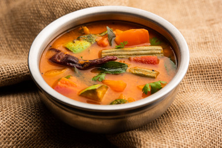 Sambar, a mixed vegetarian curry arranged on a black bowl on a wooden background. Sambar is popular in South India and Sri Lanka cuisines.