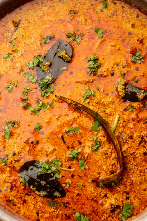 close up of a bowl of rustic indian masala curry gravy