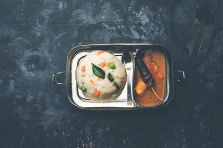 Upma Sambar in Lunch Box of stainless steel, selective focus