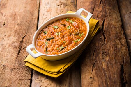 Red Lentil Cooked Dal or Dhal or Masoor daal tadka served in a bowl, selective focus