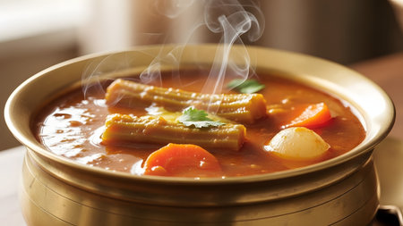 A bowl of steaming hot vegetable curry, likely Sambar or a similar Asian dish, featuring drumsticks (moringa) and carrots in a rich, spicy broth. The appetizing meal is presented in a brass bowl.