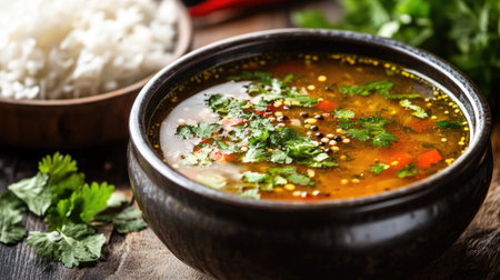 A vibrant bowl of fresh herbal soup garnished with cilantro, served alongside fluffy white rice, perfect for a comforting and healthy meal.