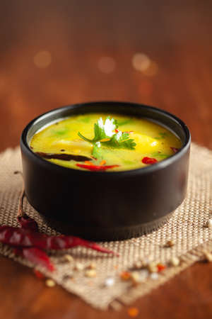 Authentic Indian popular food Dal Tadka Curry or Traditional Indian soup lentils on rustic wooden background. selective focus