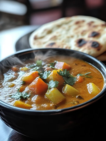 A steaming bowl of vegetable curry filled with colorful ingredients sits on a dining table. Fresh cilantro garnishes the rich dish, paired with warm bread for a delightful meal.
