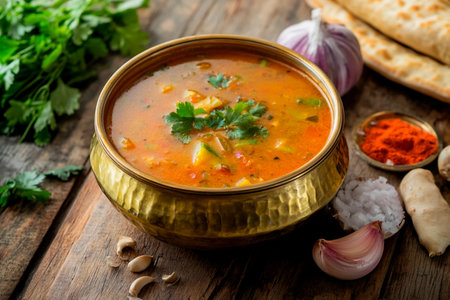 A rich, aromatic vegetable curry is served in a traditional bowl, garnished with fresh cilantro. Surrounding the dish are garlic, spices, and bread, creating a warm, inviting atmosphere.