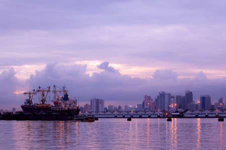 Image of the illuminated cargo port in Thailand at sunset with container terminals, cargo ships and cranes at sunset background