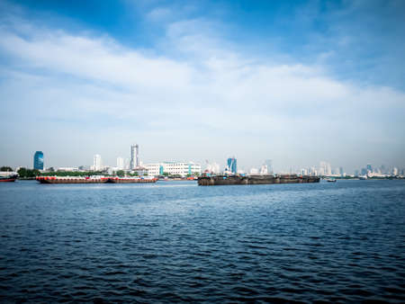 Cargo ships on the Chao Phraya River Along with the beautiful scenery of the Chao Phraya River in Thailand.