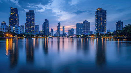 An elegant evening city skyline, lights reflecting on a calm river, skyscrapers silhouetted against a twilight sky, capturing urban beauty. Resplendent.