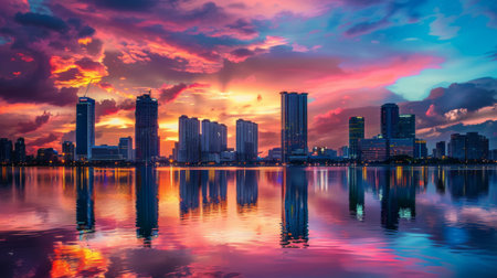 A breathtaking city skyline captured at sunset, showcasing a vibrant array of colors in the sky. This urban landscape features dramatic cloud formations and modern architecture.