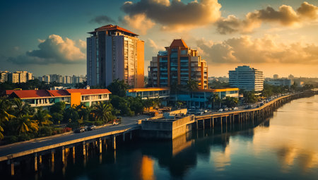 A stunning view of high-rise buildings along a riverbank at sunset, with the sky painted in warm hues.