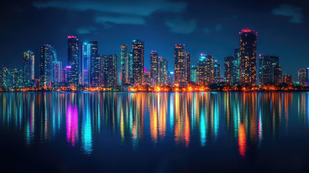 Stunning nighttime city skyline featuring vibrant reflections on the water, showcasing illuminated buildings and capturing the essence of urban life in a modern setting.