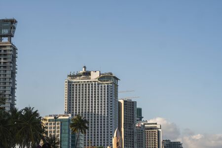 NHA TRANG, VIETNAM - JANUARY 25, 2019. Scenic summer view of the modern architecture with business skyscrapers, hotels and apartment buildings with a palm trees.