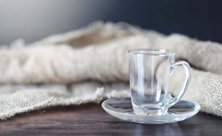 glass of water on wooden table.