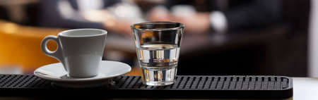 Food concept. Glass with water for espresso. Breakfast with coffee and shu dessert in cafe.