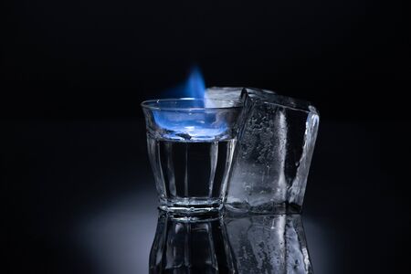 transparent glass with burning liquid near ice on black background