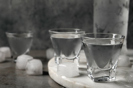 Glasses of vodka on gray background