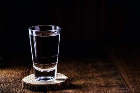 Transparent glass vodka shot on black bar. Empty copy space dark sad alcoholism background.