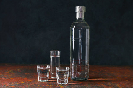 Vodka in shot glasses on rustic dark background
