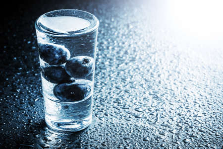 Blueberry vodka shots. Fruit alcohol background. Weekend party tasty liquor. Berries in alcohol glass. Shiny bar surface.