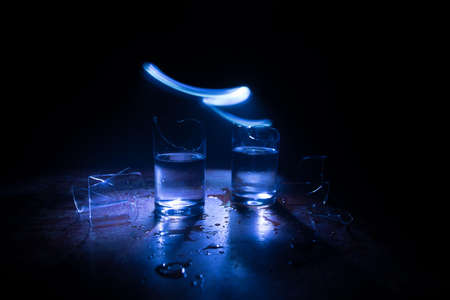 Drink, broken glass concept. Broken glasses on wooden table at dark toned background with fog. Selective focus