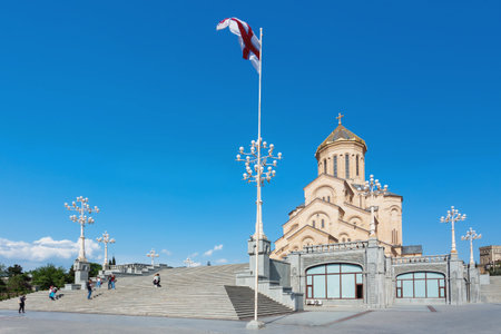 TBILISI, GEORGIA - May 1, 2017. Tourists near The Holy Trinity Cathedral of Tbilisi (commonly known as Sameba).