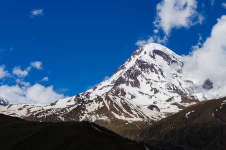 Stunning view of the snow-capped peak of Mount Kazbegi, Georgia