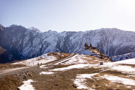 Gergeti Monastery. November 11, 2019. Georgia. Europe. Tourist route. Temple in the mountains. Favorite place of tourists