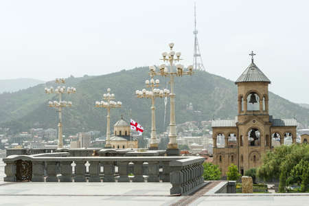 Tbilisi, Georgia - 8 October 2016: free-standing bell-tower and cross of Tbilisi Sameba Cathedral Tsminda (Holy Trinity) biggest curch Orthodox Cathedral in Caucasus region, Eurasia. Exterior. Front view
