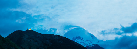 Distant view on Gergeti Trinity Church in Stepansminda, Georgia. The church is located the Greater Caucasian Mountain Range.Clouds are covering the snow-capped Mount Kazbegi in the back.Sunrise,sunset