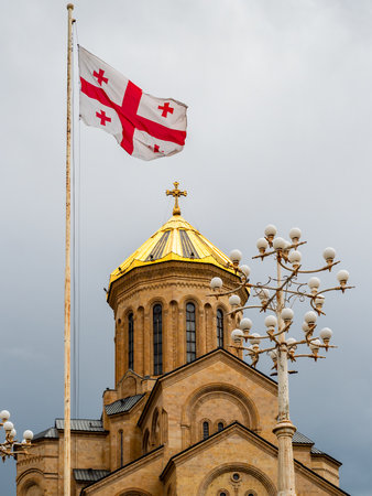 Georgian flag and Holy Trinity Cathedral (Sameba) of Tbilisi city on overcast summer day, Georgia