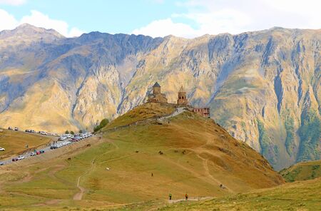 Gergeti Trinity Church near the village of Stepantsminda, popular tourist destination in the Caucasus mountains in Georgia