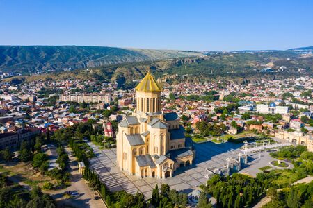 Beautiful Top view from drone to Main attraction of Tbilisi - Cathedral Tsminda Sameba Holy Trinity biggest church Orthodox in a sany summer day in Caucasus region. The main cathedral of the Georgian