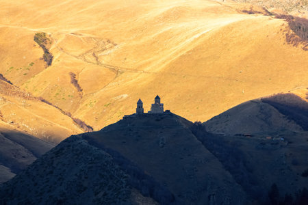 Gergeti Church Georgia at sunset. View from distance. Autumn beautiful view of the Mount Kazbek, Stepantsminda, Georgia. The nature of Georgia.