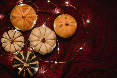 Isolated little pumpkins on a wooden table with beautiful blurred colorful background. vintage tones