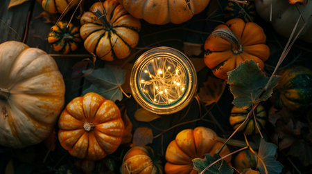 Festive autumn arrangement with fairy lights jar pumpkins closeup image, ai generated. Soft warm lighting close up photography. Cozy inviting atmosphere perfect for fall concept photo realistic