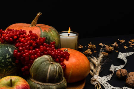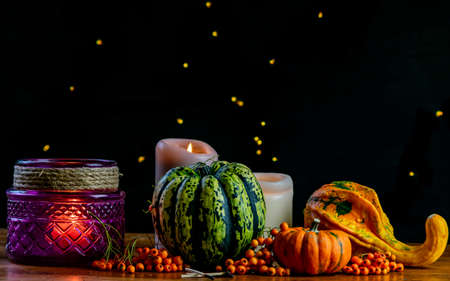 Variety of pumpkins, rowan berries and candles on rustic wooden table and black background with bokeh. Autumn symbolic vegetables in green, yellow and orange colors.