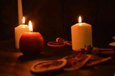 Dry rosehips, tree branches, burning candle and birds feathers on a old wooden surface, selected focus.