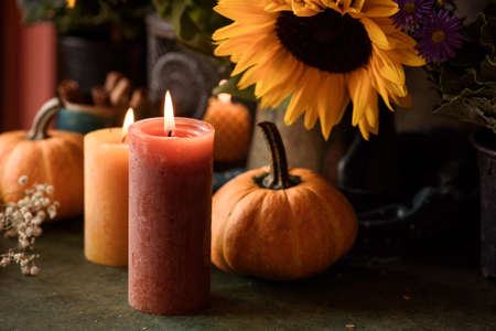 Cozy autumn table with candles, pumpkins, vibrant flowers.