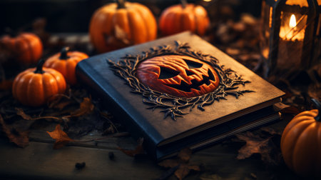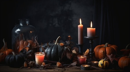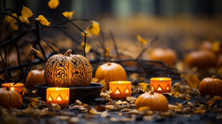 Halloween card, holiday attributes, pumpkins, candles and spiders. With Generative AI technology.