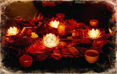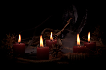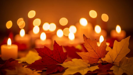 An AI-generated illustration of a wooden table with decorations illuminated by candles.
