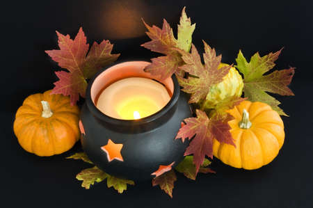 A candle in a cauldron with maple leaves and pumpkins. The reflected light from the flame casts an orange spooky glow on the background.