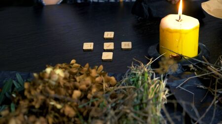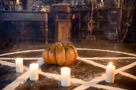 A ritual halloween witchcraft scene with candles, herbs, spider web, vintage bottles on the rustic background with a scary skull face and antique book